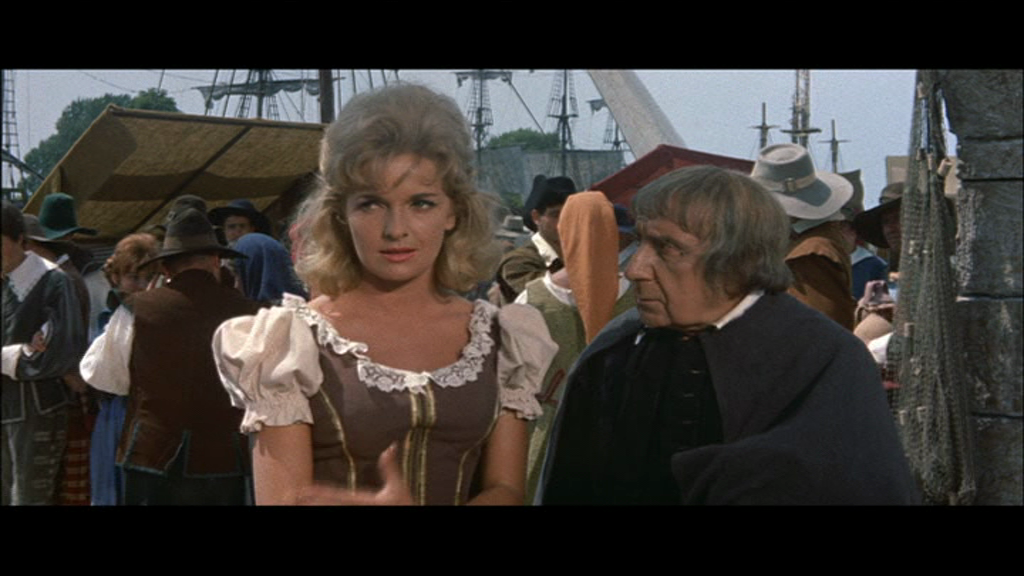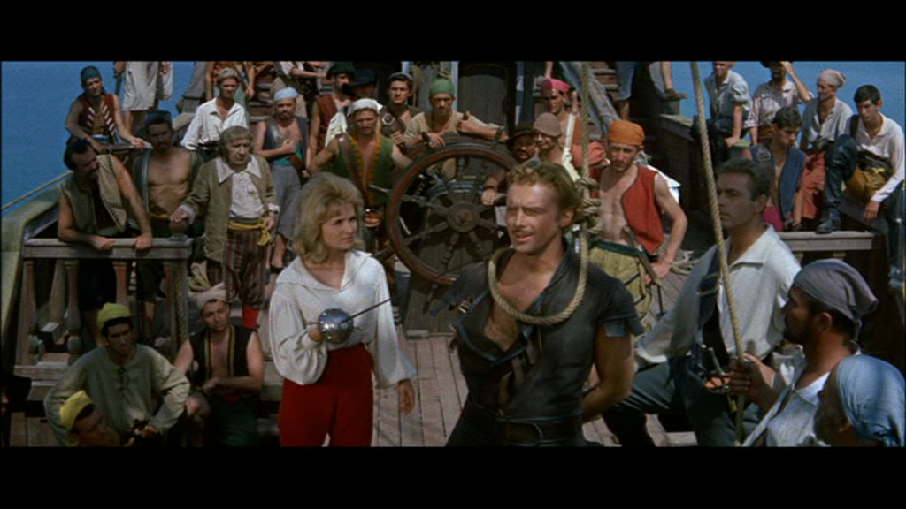 Doch die (von mir) in diesem Zusammenhang erwarteten Kämpfe und Seeschlachten sind rar gesät. Es werden lediglich eine kleine finale Schlacht sowie der ein oder andere Degenkampf, in denen Mary Read ebenso selten zum Einsatz kommt, geboten. Doch sollte sie tatsächlich am Kreuzen der Klingen beteiligt sein, dann wirkt ihr Einsatz, besonders mit Blick auf ihre prägnante Rolle, äußerst halbherzig. Das Spiel der Lisa Gastoni besitzt viel Luft nach oben und hätte deutlich mehr Enthusiasmus verdient als die Darstellerin letztendlich in ihre Rolle investiert. Ihre Darbietung ist ein Schatten dessen, was beispielshalber Jean Peters wie Maureen O’Hara oder - um Italien treu zu bleiben - Gianna Maria Canale (Consuelo in „Tiger der Meere“) in ihren Piratenrollen ab- wie aufziehen. Was die genannten Figuren unterdessen miteinander verbindet, ist - das Piratenleben mal außen vorgelassen - der Mann, der an ihre Seiten tritt und sie erobern will.