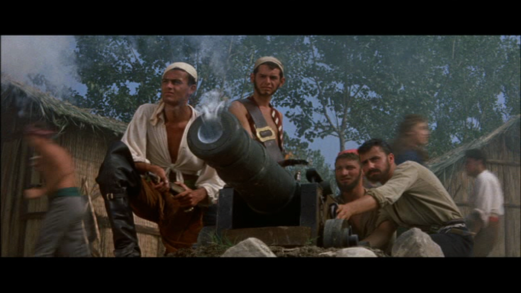 Das Kämpfe und artverwandte Actionsequenzen innert „Piratenkapitän Mary“ nur einen kleinen Part bekleiden, zeugt freilich nicht dafür, dass der Film ohne eine spezielle Form von Bewegung daherkommt. So treten weniger spektakuläre Attraktionen, der Tanz sowie die weniger als Drill denn als spielerische Leichtigkeit suggerierbare Schulung in einer Kadettenschule, in den Vordergrund. Man kann beides als besondere Schwingungen (das Pendeln zwischen zwei Identitäten) der betroffenen Protagonisten deuten. Lord Peter Goodwin, der während seiner militärischen Ausbildung zwischen Tunichtgut und Offiziersehren schwingt, Mary Read, die während eines Balls zwischen gerissener Diebin und begehrenswerter Dame schwingt. Schwingungen, die in letzter Konsequenz von symbolischer Bedeutung sind, da sich beide Personen in naher Zukunft für eine der Rollen entscheiden müssen, damit eine gemeinsame Zukunft realisierbar ist. So weit so gut, aber was mir bei dieser Konstellation fehlt, ist der für Intrigen sorgende Bösewicht. Lenzi schneiderte seinen beiden Hauptprotagonisten zwar wechselnde Rollengewänder, verzichtete allerdings auf die beidseitig spitze Nähnadel, die dem Schneiderlein das Daumenblut entzieht, welches dem Kausalprinzip folgend, die Kleidungsstücke mit alarmierenden roten Flecken dekoriert.