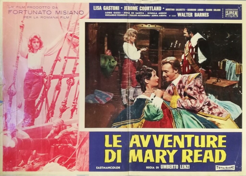 Umberto Lenzis zweite abendfüllende (!) Regiearbeit (nach „Mia Italida stin Ellada“) ist zugleich meine fünfte Besprechung eines Lenzi-Vehikels in Folge. Nachdem ich Sie zuvor in die Welten von Peplum, Eurospy und Western entführte, sind wir diesmal auf einem der sieben Meere zu Gast, um uns von seeräuberischen Geschichten aus strapazierfähigem Seemannsgarn, das sich grob an der Lebensgeschichte der Mary Read orientiert, unterhalten zu lassen. Genannte Mary Read war eine 1685 geborene und mit 36 Jahren an Fieber verstorbene Engländerin, die, wenn es die Situation erforderte, in Männerkleidung schlüpfte und, so besagen es die Erzählungen um ihre Person, unerschütterlich tapfer als Piratin wie Freibeuterin ihnen Mann stand. Lenzi inszenierte demzufolge einen Film, der keinen maskulinen, sondern einen femininen Charakter in den Fokus von Freibeuterei und Piraterie rückt. Eine Methode, die freilich kein Novum darstellt, denn in den frühen 1950er Jahren gestand man dem weiblichen Geschlecht (innert der Piratenfilme) wesentlich mehr Spielraum respektive eine Autorität zu, die ihren Vertreterinnen fortan bedeutsamere Rollen unter der lichtspielerischen Totenkopfflagge ermöglichte. So wurde Yvonne De Carlo als und in „Die Piratenbraut” (USA, 1950) mit einer deutlich dominantere Filmfunktion ausstaffiert als es bislang bei ihren Kolleginnen, die zumeist als schmückendes und vornehmlich ineffizientes love interest auftraten, der Fall war. Noch deutlicher wurde der feminine Ausnahmezustand mittels „Die Piratenkönigin“ (USA, 1951), wo Jean Peters als femininer swashbuckler den symbolischen Segelmast erklomm und einhergehend gar zur allegorischen Herrin der sieben Meere emporstieg. Ein weiteres Beispiel ist Maureen O’Hara als die Piratin Prudence Stevens, der innert George Shermans „Gegen alle Flaggen“ die Wahl zwischen dem bürgerlichen und dem Piratenleben offeriert wurde. Ich könnte die Liste mit den Filmproduktionen „Lady Rotkopf“ und „Die Geliebte des Korsaren“, beide 1952 in den USA fertig gestellt, erweitern, da ich diese Filme jedoch bisher nicht sichten durfte, fehlt mir der benötigte Background, um sie wirklich eindeutig zu kategorisieren, sodass ich die Titel nur mit vorgehaltener Hand nennen mag.