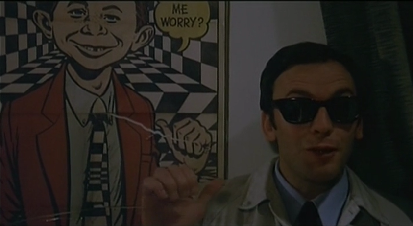 Wer bei ICH BIN WIE ICH BIN einen astreinen Giallo erwartet, der wird wohl bitterlich enttäuscht werden, denn die Inszenierung entpuppt sich vielmehr als eine vom Film Noir inspirierte Kriminalgeschichte, die mit Stilistiken aus der Pop-Art-Szene angereichert wurde. Rasende Alfas, Klappmesser, J&B und schwarze Handschuhe sucht man hier vergebens. Neben dem Einsatz einer äußerst innovativen Kameratechnik sind es vor allem solche Stilmittel wie beispielsweise Split-Screen-Aufnahmen oder ständige Farbwechsel, bei denen aus einer knallbunten Farbenwelt abrupt Schwarz-Weiß-Landschaften werden. Hinzu gesellen sich eine experimentelle Schnitttechnik sowie zahlreiche Pop-Art-Zitate, die von den Beatles, über Alfred E. Neumann, Roy Lichtenstein, Blow Up, Batman bis hin zu Pepsi-Cola reichen. Etwas Erstaunen ließ mich die Szene in der Wohnung des ermordeten Clubbesitzers, da in dieser eine gebügelte Nazi-Uniform direkt neben einem anarchischen MAD-Poster fein säuberlich ausgestellt wird. Was die Handlung angeht, so entpuppt sich diese stellenweise als recht konfus. Kein Wunder, denn scheinbar schnitt Tinto Brass den Film während des Drehs mehrfach um. Ein Grund für das ständige Verändern sollen seine Bedenken gewesen sein, dass die ursprüngliche Schnittfassung das Publikum womöglich überfordert hätte. Als Folge entfernte er sämtliche erklärende Hintergründe, da diese seiner Meinung nach von der zentralen Beziehungsgeschichte zwischen Bernard und Jane ablenkten, die er als das eigentliche Kernstück seines Films ansah. Zumindest scheint in der ständigen Veränderung des Films ein Grund zu liegen, warum die Handlung stellenweise schwer nachvollziehbar scheint.