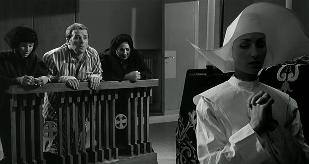 Neben ironisch bösen Anleihen, die gerade in der deutschen Synchronfassung noch ein wenig trockener anmuten, geben sich beispielsweise seichte Albernheiten als auch etwas Klamauk fortwährend die Klinke in die Hand, ohne dabei aber die Grenze des Unzumutbaren auch nur ansatzweise zu tangieren. Dementsprechend reicht das Humorspektrum des Films von charmantem Grobsinn bis hin zu gepfeffertem Feinsinn, was zugleich auch der vielschichtigen Inszenierungsweise des Films entspricht, denn HERR DOKTOR, DIE LEICHE LEBT entpuppt sich letztendlich als ein filmisches Unikat, das seines Gleichen sucht. Egal ob Situationskomik, die brillante Gesichtsmimik des grandiosen Hauptdarstellers Renato Salvatori oder auch einfach nur vergnügliche Dialoge, das Humorspektrum in Ugo Gregoretti intergalaktischem Unfug scheint unerschöpflich zu sein. Neben der prägnanten Bücher-Szene sticht auch noch der Moment des unverfrorenen Journalisten heraus, der Omicron am Krankenbett allerhand Blödsinn lernt, sowie das Erwachen im Körper des toten Angelos. Ansonsten unterlaufen Omicron, bei dem sich übrigens auch eine Turbolunge entwickelt hat, des öfteren mal kleinere Fehlinterpretationen beim Transfer des Erlernten, was wiederum zu ausgelassener Heiterkeit führt. Wer natürlich auch nicht unerwähnt bleiben darf, ist die reizende Rosemary Dexter, die in HERR DOKTOR, DIE LEICHE LEBT ihr Schauspieldebüt feiert. Dabei spielt sie die Betriebskantinenmitarbeiterin Lucia, auf die es Omicron im letzten Drittel des Films abgesehen hat.