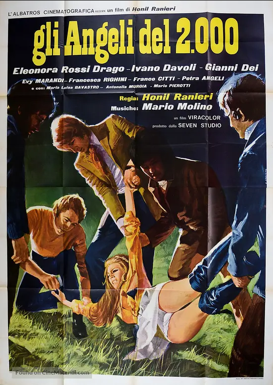 Gerade in den Jahren 1967 - 1970 entstanden in Italien zahlreiche filmische Kleinode, die aufgrund ihrer besonderen Einzigartigkeit eben auch nur im kreativen Schmelztiegel der 68er Bewegung entstehen konnten. GLI ANGELI DEL 2000 würde ich ebenfalls zu der Sorte von Filmen zählen, zu denen beispielsweise auch VERGOGNA SHIFOSI, LA STAGIONE DEI SENSI, LA RIVOLUZIONE DE SESSUALE, ESCALATION, H2S, QUARTA PARETE, FEMINA RIDEN, FERMATE IL MONDO VOGLIO SCENDERE oder MANGIALA (EAT IT) gehören. Zwar unterscheiden sich die aufgezählten Werke sowohl von ihrer Thematik als auch von der jeweiligen Herangehensweise und Machart, versprühen aber dennoch gemeinsam den Geist der hochinnovativen und farbenprächtigen Psychedelic-Ära. Für die Inszenierung der vorliegenden Obskurität zeichnete sich ein gewisser Lino Ranieri aus, der bis dahin lediglich als Nebendarsteller in LA BELLE FAMIGLIE (1964), SICARIO 77 - TOT ODER LEBENDIG (1966) und RAMON IL MESSICCANO (1966) in Erscheinung trat. Für GLI ANGELI DEL 2000 wechselte Ranieri schlagartig seine bisherige Beschäftigung, denn er verlagerte nicht nur sein neues Betätigungsfeld hinter die Kamera, sondern fungierte auch zugleich als Drehbuchautor und Produzent. Dabei änderte er auch seinen Vornamen in Hanil (Regie) als auch zugleich in Honil (Drehbuch). Der spärlichen Informationslage nach bekam Ranieri nach der Fertigstellung des Films zunächst ordentlich Ärger mit der staatlichen Zensurbehörde, was wiederum dazu führte, dass die vom Regisseur intendierte Ursprungsfassung bereits im Vorfeld erheblich Federn lassen musste. Was folgte, waren ein langwieriges Verfahren, eine verspätete Kinopremiere und viel zu geringe Besucherzahlen. Der Film floppte und verschwand in der völligen Versenkung, bis Anfang 2019 urplötzlich digitale Kopien einer augenscheinlich privat-abgetasteten 35mm Filmrolle auftauchten - denn GLI ANGELI DEL 2000 wurde bis dato weder auf VHS noch als Super-8-Fassung veröffentlicht und vermutlich noch nicht einmal im italienischen TV ausgestrahlt. Leider befand sich das aufgefundene 35mm Material in einem sehr suboptimalen Zustand, denn verbliebene Restfarben sucht man auf dieser Kopie leider vergebens. Lediglich die beiden lysergsäurediethylamid-haltigen Rauschszenen weisen einzig noch eine gewisse Farbenpracht auf, was wiederum darauf schließen lässt, dass der damalige Wirkstoffgehalt auch heutzutage noch völlig verblasste Filmkopien wieder farblich hellauf erleuchten lässt.