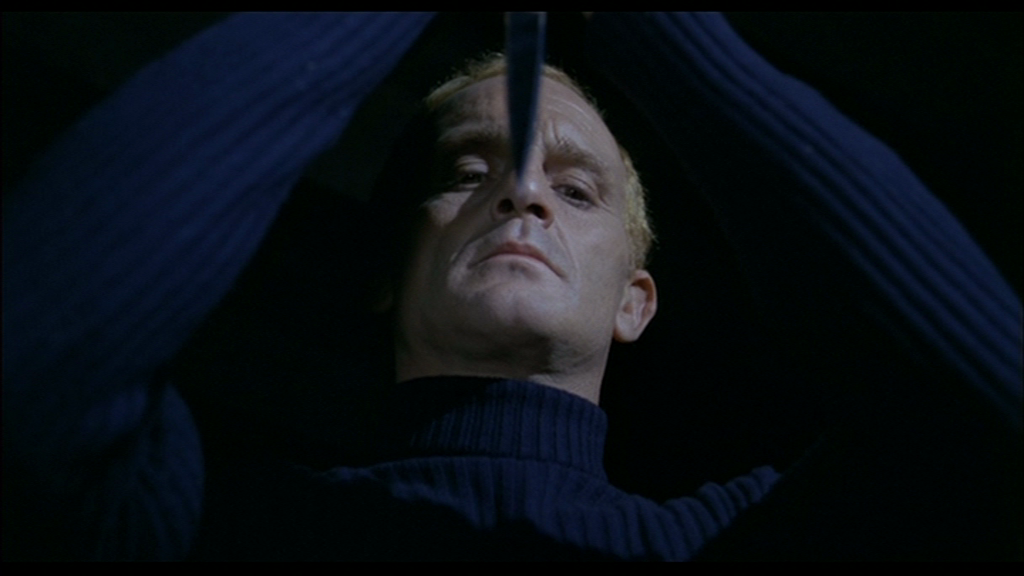FEMINA RIDENS entpuppt sich zudem als eine Art Kammerspiel, in dem Dagmar Lassander und Philippe Leroy fast den gesamten Handlungsverlauf über in den vier Wänden eines Ferienhauses eine unglaublich gute Darbietung ablegen. Ein paar wenige Nebendarsteller tauchen zwar zu Beginn und am Ende des Films kurzzeitig auch noch in Erscheinung, aber den Großteil der Spielzeit präsentieren sich die beiden Hauptdarsteller allein auf weiter Flur. Philippe Leroy spielt eindrucksvoll einen angesehenen Philanthropen, der infolge eines tiefsitzenden Kindheitstraumas nicht nur absonderliche sexuelle Neigungen entwickelt hat, sondern auch ein angstbesetztes Frauenbild, was ihm im Rahmen seiner fehlgeleiteten Sozialisation wiederum dazu verleitet, diese unter seine patriarchale Kontrolle zu bringen. Obendrein scheint er sexuell gehemmt zu sein, was wiederum dazu führt, dass er sich nur befriedigt fühlt, wenn der passionierte Dolchsammler seinen versklavten Sexpartnerinnen auf dem Höhepunkt den Gar aus machen kann. Der Auslöser für sein Trauma sieht er in einer Kindheitserfahrung begründet, bei der leibhaftig miterleben musste, wie ein abgrundböses Skorpionweibchen ihr Männchen nach dem gemeinsamen Liebesspiel anstandslos verspeiste. Das daraus resultierte Angstgefühl geht bei ihm mittlerweile soweit, dass er befürchtet, Frauen könnten sich infolge ihrer ungebremsten Selbstbestimmung zukünftig zum Zwecke der Fortpflanzung selbst befruchten, was wiederum seiner Ansicht nach das männliche Geschlecht endgültig überflüssig machen würde. Und genau aus diesem Grund lädt sein Rollencharakter Dr. Sayer fremde Frauen in sein Wochenendhaus ein, um diese in entspannter Atmosphäre zu erniedrigen, ihnen seine männliche Überlegenheit zu demonstrieren und sie schließlich auf dem Höhepunkt seines sexuellen Empfindens kurzerhand ableben zu lassen. Ein Fest für antifeministische Männergruppen, die aber spätestens in der zweiten Filmhälfte vollkommen verzweifeln dürften, denn die bis dahin malträtierte Dagmar Lassander besinnt sich plötzlich auf eine der effektivsten Fertigkeiten der Weiblichkeit - die weibliche List.